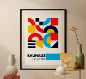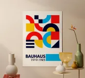 Un homenaje excepcional a la precisión geométrica de los movimientos Bauhaus y De Stijl. Esta obra de arte modular presenta una composición equilibrada de semicírculos, cuadrantes y cuadrados en la característica paleta primaria: rojo vivo, amarillo brillante y azul cian, acentuados con blanco y negro. El diseño muestra los principios del funcionalismo y la abstracción pura, creando un ritmo visual dinámico. En la parte inferior aparece el texto "BAUHAUS 1919-1923", que refuerza el contexto histórico. Este póster digital de alta calidad se presenta con una impresionante resolución de 7000 x 5000 píxeles y 300 ppp, lo que garantiza una calidad profesional.