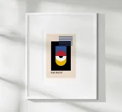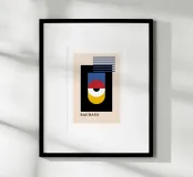Una impresionante abstracción geométrica que resume a la perfección los movimientos Bauhaus y Constructivismo. Este dinámico póster presenta un motivo central en capas que se asemeja a un ojo o una diana, compuesto por los colores primarios -rojo, azul y amarillo- sobre un crudo rectángulo negro. La composición se acentúa con una serie de rayas azules horizontales flotantes, que constituyen una clase magistral de equilibrio y contraste. Este diseño vibrante e intelectual es una pieza ideal para los coleccionistas de arte moderno de mediados de siglo, maximalista o abstracto que aprecian la pureza de la forma y el color. El texto dice "BAUHAUS