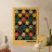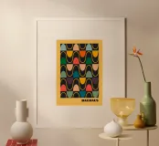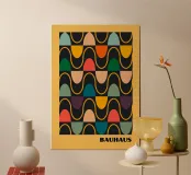 Un cartel abstracto vibrante y cautivador que combina los principios de la Bauhaus con una estética lúdica de la modernidad de mediados de siglo (MCM). El diseño presenta una línea ondulada amarilla continua y sinuosa que se entrelaza con hileras de coloridas formas orgánicas semicirculares (o medios óvalos). La rica paleta de tonos joya incluye terracota, amarillo mostaza, verde bosque, verde azulado intenso y rosa oscuro, todo ello sobre un sofisticado fondo azul marino oscuro. Este patrón groovy crea un efecto hipnótico y rítmico. Ofrecido como un archivo de arte digital superior (7000x5000 píxeles, 300 ppp), esta impresión garantiza colores excepcionales.
