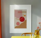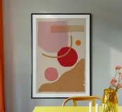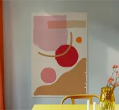 Una obra abstracta minimalista con un fondo texturizado de color rosa rubor y formas sencillas y equilibradas en rojo y crema. La pieza es sofisticada, moderna y tiene una calidad táctil y serena.