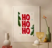 "Ho Ho Ho": la personificación de la alegría navideña. Este cartel combina una atrevida tipografía en rojo y rosa con detalles juguetones como copos de nieve y ramas de abeto. Un diseño moderno que combina el clásico espíritu navideño con un aspecto fresco. Perfecto como arte mural para las fiestas o como idea de regalo para cualquiera que celebre la Navidad de forma colorida y alegre.