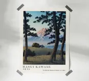 Una impresionante impresión digital del maestro de la xilografía japonesa Hasui Kawase. La escena capta una impresionante vista del monte Fuji, con su cima nevada resplandeciendo a la suave luz del amanecer o del atardecer. La majestuosa montaña está enmarcada por los troncos oscuros y texturados de los pinos, que añaden profundidad y escala. En el centro, un granjero con un carro cargado tirado por un buey atraviesa una colina cubierta de hierba, un detalle que añade un elemento humano al sereno paisaje. Este póster de alta resolución (7000x5000 píxeles, 300 ppp) reproduce con gran belleza el estilo icónico de los grabados japoneses en madera, mezclando