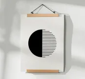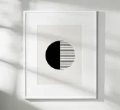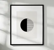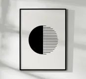 Obra de arte geométrica minimalista con líneas negras y un semicírculo negro sobre un fondo neutro de color beige suave.