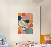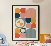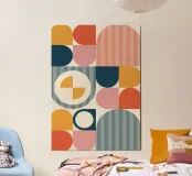Un póster de motivos geométricos vibrantes y repetitivos que combina con maestría bloques de color y elementos lineales, profundamente enraizados en los estilos moderno de mediados de siglo y abstracto contemporáneo. El diseño presenta un mosaico de rectángulos redondeados (arcos) en tonos cálidos de óxido, amarillo mostaza y rosa rubor, que contrastan con el azul marino intenso. Las llamativas secciones a rayas -verticales rojo/blanco y curvas verde azulado oscuro/blanco- añaden una textura dinámica. Un elemento central incluye una diana circular dividida en cuadrantes naranja y crema. Esta descarga digital premium (7000x5000 píxeles, 300 ppp) garantiza una calidad de impresión superior y c