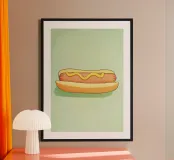 Una ilustración minimalista, limpia y divertida, con un perrito caliente clásico centrado en el marco. La rolliza salchicha de color rojo anaranjado y el panecillo ligeramente tostado están coronados por una brillante línea curva de mostaza amarilla. Toda la composición se enmarca en un fondo verde menta suave y texturizado, que crea un llamativo contraste que acentúa la sencillez del tema. La obra tiene una calidad gráfica atrevida, que recuerda la estética del Pop Art. Esta obra es perfecta para añadir un toque de encanto extravagante y moderno a una cocina o un comedor. Este póster digital de calidad superior se suministra en un embalaje excepcional.