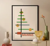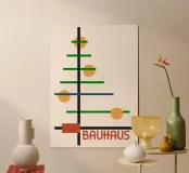 Una composición abstracta creativa y minimalista que evoca la forma de un árbol, muy influida por los principios geométricos y funcionalistas del movimiento Bauhaus. El "árbol" está construido a partir de una atrevida línea vertical negra cruzada por líneas horizontales de longitud variable, principalmente de color verde intenso, junto con toques de azul oscuro y terracota. Cuatro círculos de color amarillo dorado representan frutas u ornamentos. La composición se sitúa sobre un fondo neutro pálido, con "BAUHAUS" en una fuente retro con gracias en la base. Este archivo de arte digital de alta calidad (7000x5000 píxeles, 300 ppp) garantiza una imagen nítida y mo