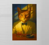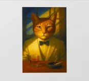 Un felino digno de un papel protagonista. Casablanca Cat muestra a un llamativo gato atigrado naranja sentado a una mesa en penumbra, vestido con un esmoquin crema y pajarita negra. Delante de él descansa un vaso de whisky y un cigarro humeante en un cenicero pesado, cuyo humo se eleva en volutas pictóricas. La luz dorada se filtra por una ventana, proyectando sombras geométricas que acentúan el ambiente noir.