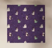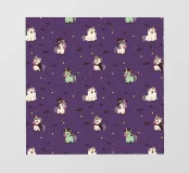 Esta ilustración presenta un estampado de adorables unicornios vestidos con espeluznantes disfraces de Halloween, como fantasma, bruja, vampiro y Frankenstein, rodeados de estrellas y murciélagos.