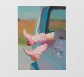El motivo muestra un escenario elegante y veraniego con un toque de libertad y aventura. Una persona con botas vaqueras rosas se relaja con las piernas colgando fuera de un coche turquesa: los colores vivos y las suaves pinceladas confieren a la escena un ambiente cálido y de ensueño. Esta imagen capta a la perfección la sensación de un viaje por carretera, el sol y la despreocupación.