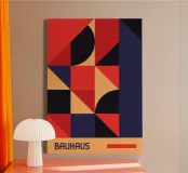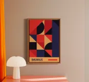 Un poderoso póster abstracto Bauhaus dominado por un mosaico geométrico de cuadrados, triángulos y cuartos de círculo en una atrevida paleta de inspiración primaria: rojo intenso, azul marino y melocotón/naranja cálido. La composición presenta un llamativo bloque vertical azul marino a la derecha y una banda horizontal melocotón en la parte inferior, creando una fuerte división. Este diseño encarna a la perfección la belleza estructurada y funcional del Modernismo. Este archivo de póster digital de calidad superior (7000x5000 píxeles, 300 ppp) garantiza detalles de alta resolución y colores ricos e impactantes para una impresión de primera calidad.