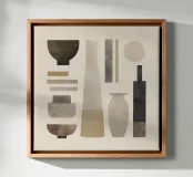 Ilustración minimalista con jarrones, cuencos y formas geométricas dispuestas en una limpia composición cuadrada. El beige natural y los tonos tierra lo convierten en un estampado versátil para interiores modernos, escandinavos o bohemios.