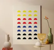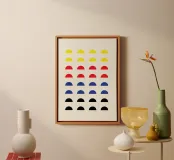 Un impresionante cartel digital que se inspira en los principios minimalistas y geométricos del De Stijl y la Bauhaus. El diseño presenta una cuadrícula precisa de semicírculos dispuestos en columnas verticales e hileras horizontales. Los colores se limitan estrictamente a los primarios -amarillo, rojo y azul- más el negro, sobre un sutil fondo blanco roto. Esta composición rítmica y estructurada ofrece una estética limpia, atrevida y moderna. Esta descarga digital de alta calidad tiene 7000 x 5000 píxeles a 300 ppp, lo que garantiza una claridad excepcional y una calidad de impresión superior para el arte de gran formato.
