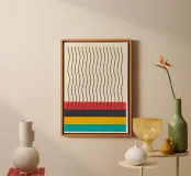 Este vibrante póster abstracto capta la esencia de la modernidad de mediados de siglo y del diseño gráfico contemporáneo. La parte superior presenta una serie de delicadas líneas negras onduladas dibujadas a mano sobre un fondo blanco cremoso, que crean una sensación de movimiento y textura. Debajo, la composición está anclada por llamativos bloques de color en rojo intenso con un borde inferior dentado, gris carbón, amarillo mostaza y un azul cerceta brillante. Esta pieza divertida pero sofisticada es perfecta para añadir un toque de color y encanto retro a cualquier espacio. Se entrega en un archivo digital de calidad superior de 7000x5000 píxeles y 300 ppp para un s
