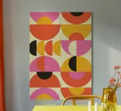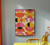 Un cartel vibrante y divertido con un intrincado patrón repetido de formas geométricas abstractas, principalmente semicírculos y cuadrantes. El diseño utiliza una atrevida paleta de colores retro de rosa fuerte, naranja intenso, amarillo mostaza y negro, sobre un cálido fondo crema. Finas líneas concéntricas negras se superponen a varias formas, añadiendo un toque técnico y moderno de mediados de siglo. Este archivo de póster digital de calidad superior (7000x5000 píxeles, 300 ppp) garantiza detalles de alta resolución y colores ricos y saturados para una declaración interior verdaderamente groovy.