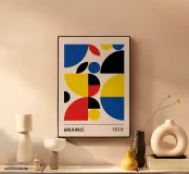 Un cartel digital vibrante y atractivo que celebra la fundación de la Bauhaus en 1919. Esta composición altamente abstracta es una interacción dinámica de formas geométricas -círculos, semicírculos y curvas- en la icónica paleta de colores primarios: rojo intenso, azul profundo y amarillo brillante, además de negro. Estas formas se sitúan sobre un fondo cremoso de color blanco roto, creando un patrón complejo y rítmico característico de la estética modernista minimalista. Esta descarga digital de alta calidad tiene 7000x5000 píxeles a 300 ppp, lo que garantiza una claridad excepcional y una calidad de impresión superior.