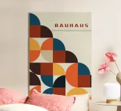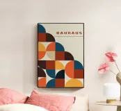 Un motivo geométrico abstracto y dinámico profundamente inspirado en los movimientos Bauhaus y Moderno de mediados de siglo. La imagen presenta un patrón repetitivo de cuartos de círculo y cuadrados, meticulosamente organizados en una cuadrícula que llena las tres cuartas partes inferiores del marco. La paleta de colores es rica y terrosa, dominada por el naranja terracota, el amarillo cálido (ocre/mostaza), el verde azulado/azul oscuro y un sofisticado marrón moca, todo ello sobre un relajante fondo blanco roto. La audaz tipografía "BAUHAUS" ancla la minimalista sección superior. Esta obra de arte digital, que se ofrece en un impresionante formato de 7000x5000 píxeles a una resolución de 300 ppp, está disponible en inglés y francés.
