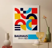Un homenaje excepcional a la precisión geométrica de los movimientos Bauhaus y De Stijl. Esta obra de arte modular presenta una composición equilibrada de semicírculos, cuadrantes y cuadrados en la característica paleta primaria: rojo vivo, amarillo brillante y azul cian, acentuados con blanco y negro. El diseño muestra los principios del funcionalismo y la abstracción pura, creando un ritmo visual dinámico. En la parte inferior aparece el texto "BAUHAUS 1919-1923", que refuerza el contexto histórico. Este póster digital de alta calidad se presenta con una impresionante resolución de 7000 x 5000 píxeles y 300 ppp, lo que garantiza una calidad profesional.