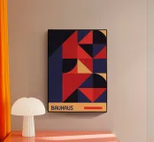 Un impresionante cartel abstracto en la audaz tradición geométrica de la Bauhaus y De Stijl. La composición es un patrón denso y entrelazado de triángulos y cuartos de círculo que crea una sensación de movimiento y profundidad. La rica paleta de colores incluye un azul marino intenso, un rojo llamativo y un cálido melocotón/ocre, que logran un equilibrio visual dinámico. La palabra "BAUHAUS" aparece claramente en una banda ocre en la parte inferior. Este arte digital de primera calidad (7000x5000 píxeles, 300 ppp) garantiza una claridad excepcional y una reproducción de colores vibrantes, lo que lo convierte en una pieza perfecta y de gran impacto para interiores modernos.
