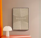 Un sofisticado póster abstracto de tonos neutros inspirado en el movimiento Bauhaus y la ilusión dinámica del Op Art. El diseño presenta cuatro cuadrantes de líneas curvas e irradiantes de color crema sobre un fondo sólido y cálido de color beige/taupé, creando una hipnotizante ilusión óptica de profundidad y movimiento. Esta pieza ofrece una visión minimalista y elegante de la abstracción geométrica. Los textos "BAUHAUS" y "JULI - SEPT 1923" aparecen centrados. Suministrada como archivo digital de alta calidad (7000×5000 píxeles, 300 ppp), esta obra de arte garantiza una impresión nítida y de alta definición perfecta para un interior contemporáneo de tonos neutros.