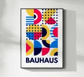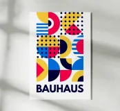 Un cartel abstracto increíblemente vibrante y complejo, que abraza plenamente el espíritu del movimiento Bauhaus con su uso de colores primarios (rojo, amarillo, azul) y formas geométricas fundamentales. La composición es un dinámico collage de círculos, semicírculos y elementos estampados, como lunares y rayas horizontales, todo ello sobre un fondo blanco. La intrincada disposición crea una sensación de alegre movimiento y densidad visual. La palabra "BAUHAUS" aparece en negrita en la parte inferior, en azul marino. Este archivo digital de alta resolución (7000x5000 píxeles, 300 ppp) garantiza una asombrosa precisión cromática y una excelente calidad de imagen.