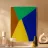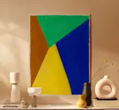 La imagen muestra atrevidas formas geométricas en colores vibrantes, como azul, verde, amarillo y marrón. Cada segmento contrasta fuertemente, creando un efecto visual dinámico.