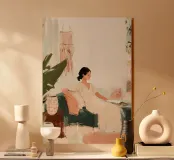 Este elegante póster digital representa una tranquila escena de una mujer que se relaja en un sofá leyendo un libro. La obra utiliza una paleta neutra, tranquila y sofisticada, en la que predominan los blancos cremosos, el terracota suave, el verde salvia y el verde azulado intenso, que le dan un aire bohemio y minimalista. La figura lleva un vaporoso vestido crema, y el fondo presenta sutiles detalles bohemios, como un tapiz de macramé y una gran maceta. La textura y las pinceladas, realizadas con un refinado estilo empastado, añaden profundidad sin opacar la serenidad del momento. Este archivo de arte digital premium (7000x5000 píxeles, 300 ppp) ofrece