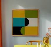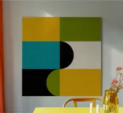 Inspirada en la Bauhaus y en la estética moderna de mediados de siglo, esta obra de arte presenta atrevidos bloques geométricos en amarillo, verde, azul, negro y blanco roto. Sus líneas limpias y fuertes contrastes capturan la armonía atemporal del diseño modernista.