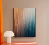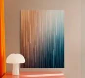 Esta llamativa obra abstracta captura una hermosa y serena transición, con un suave degradado que va de los tonos cálidos y soleados de la izquierda a los fríos y profundos tonos azules de la derecha. La composición está definida por una serie de líneas verticales, que varían en longitud y opacidad, creando una sensación de movimiento y fluidez dinámicos. Esta obra de arte evoca una sensación de tranquila contemplación y elegancia moderna, lo que la convierte en un complemento perfecto para cualquier espacio contemporáneo. Es una metáfora visual de los viajes paralelos del día y la noche, el calor y el frío, o el amanecer y el atardecer.