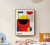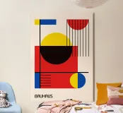 Un dinámico póster abstracto Bauhaus que celebra la geometría pura y los colores primarios. El diseño integra magistralmente rectángulos rojos, círculos amarillos y azules y audaces líneas negras en una composición impactante. Los elementos incluyen un gran cuadrado rojo superpuesto con un círculo negro parcial, un círculo amarillo completo y barras negras verticales que crean tensión visual. Esta obra resume a la perfección el espíritu modernista y constructivista. Este póster digital se entrega en una resolución superior de 7000x5000 píxeles a 300 ppp, lo que garantiza una calidad de impresión excepcional para una declaración audaz en su interior moderno de