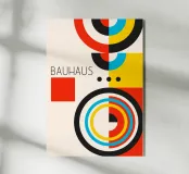 Este llamativo cartel encarna los principios de la Bauhaus y el De Stijl, con una disposición equilibrada y dinámica de círculos, cuadrados y líneas. La paleta se limita a los colores primarios -rojo, amarillo y cian- más el negro, sobre un fondo blanco roto. Los elementos clave son grandes círculos concéntricos con bloques de color segmentados y un prominente cuadrado rojo. El diseño lleva el rótulo "BAUHAUS" en un tipo de letra limpio y moderno. Esta ilustración digital se suministra con una resolución de alta definición de 7000x5000 píxeles, 300 ppp, lo que garantiza una calidad de impresión excepcional para una experiencia artística sofisticada. Etiquetas :