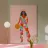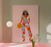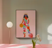 Una divertida y elegante ilustración de arte pop maximalista con una figura femenina segura de sí misma sobre un fondo rosa suave y texturizado. La protagonista lleva un moderno mono de cuello de pico cubierto por un estampado abstracto de grandes manchas orgánicas en colores verde azulado, morado intenso, naranja, rosa fuerte y verde lima. Los accesorios realzan su estilo retro y expresivo: unas gruesas gafas de sol redondas con cristales azules, una elegante boina color crema, unas brillantes pulseras apiladas y unos zapatos de tacón rojos. Lleva un bolso circular naranja a juego, que añade estructura gráfica al look. La obra de arte encarna la tendencia Dopamine Decor con su fea