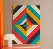 Un póster abstracto de gran energía que presenta un patrón de rombos audaz y repetitivo creado por la intersección de rayas diagonales. La combinación de colores es una paleta vibrante y retro de rojo brillante, amarillo soleado, verde azulado intenso y gris marengo, que contrasta con un blanco roto limpio. La disposición de los bloques de color crea una fuerte sensación de movimiento visual y un fascinante efecto Op Art, que atrae la mirada del espectador hacia el punto central. Este diseño geométrico refleja la estética estructurada pero lúdica de los gráficos de la Bauhaus y la modernidad de mediados de siglo. Esta descarga digital de alta resolución (7000x5000 píxeles, 300 ppp) garantiza