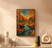 Sea testigo de la dramática intensidad de la naturaleza con este vibrante grabado expresionista. La escena capta la carrera anual del salmón en una gloriosa naturaleza otoñal, donde una madre oso y su osezno observan a los peces saltar del río azul brillante. Los imponentes abedules blancos y el follaje naranja intenso enmarcan la dinámica acción, mientras los ciervos pastan tranquilamente en el fondo. Esta atrevida pieza maximalista es perfecta para inyectar la estética otoñal en la decoración de tu cabaña o cottage. El archivo digital de calidad superior (7000x5000 píxeles, 300 ppp) garantiza un detalle asombroso y una saturación de color intensa para un resultado de alta calidad.