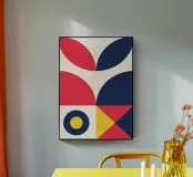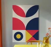 Un cartel abstracto equilibrado y colorista que combina armoniosamente formas geométricas sencillas con formas orgánicas estilizadas, evocando un aire botánico moderno. El diseño presenta una atrevida paleta de inspiración primaria en azul marino intenso, rojo brillante y amarillo soleado, sobre un fondo crema claro. Los elementos clave incluyen formas curvas en forma de hoja en la parte superior, yuxtapuestas con semicírculos, un motivo en forma de diana y un patrón triangular central en la parte inferior. Esta pieza encarna a la perfección los principios funcionales y estéticos de los movimientos Bauhaus y Moderno de mediados de siglo. El archivo digital de alta resolución (70