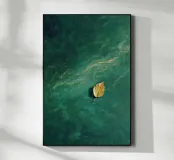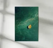 Una solitaria hoja otoñal se desliza suavemente por una masa de agua de un verde intenso. Esta composición minimalista evoca una sensación de calma, tranquila introspección y la sosegada belleza de la naturaleza en movimiento. Perfecta para espacios serenos y meditativos, invita al espectador a la quietud y a la reflexión poética.