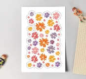 Un alegre motivo floral que parece un paseo visual por un festival de jardinería retro: Las estilizadas flores de color naranja, rosa, morado, rojo y amarillo bailan libremente. Cada flor tiene una forma sencilla, parecida a una margarita, con pétalos largos y radiantes que surgen de un punto central. La disposición es deliberadamente irregular, como un patrón disperso de alegría, verano y nostalgia.