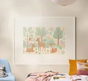 Bosque mágico en tonos pastel con ciervos, búhos y zorros poster