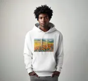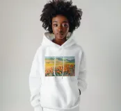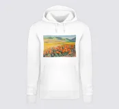 Un campo de vibrantes amapolas naranjas crea un brillante mosaico de color sobre ondulantes colinas verdes y doradas, representado de una forma estilizada y moderna que enfatiza la alegría del paisaje.