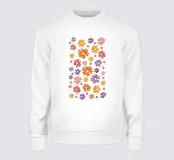 Un alegre motivo floral que parece un paseo visual por un festival de jardinería retro: Las estilizadas flores de color naranja, rosa, morado, rojo y amarillo bailan libremente. Cada flor tiene una forma sencilla, parecida a una margarita, con pétalos largos y radiantes que surgen de un punto central. La disposición es deliberadamente irregular, como un patrón disperso de alegría, verano y nostalgia.