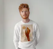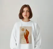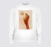 Ilustración minimalista en cálidos tonos terrosos. Una mano estilizada se extiende hacia el sol, mientras que las suaves hojas del fondo añaden una sensación de equilibrio y naturaleza. La obra transmite sencillez, serenidad y una tranquila conexión con el mundo natural.