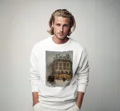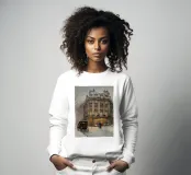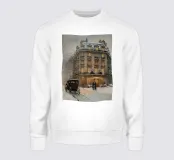 Un romántico paisaje urbano con un toque invernal: un coche negro tirado por caballos se detiene en la nieve fresca delante de un magnífico edificio antiguo con ventanas cálidamente iluminadas. Dos personas elegantemente vestidas conversan mientras las farolas proyectan una luz dorada sobre la calle nevada. La escena evoca una época pasada, la elegancia y la tranquila belleza de una tarde nevada en la ciudad.