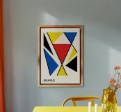 Une affiche abstraite très dynamique et déconstruite de style Bauhaus, dominée par un arrangement énergique de triangles. La composition utilise d'épaisses lignes noires pour délimiter diverses formes fragmentées remplies des couleurs primaires emblématiques (rouge, jaune et bleu), de noir et de blanc. L'œuvre d'art qui en résulte est un exemple frappant de tension et d'équilibre géométrique moderniste. Ce fichier d'art numérique de qualité supérieure est fourni à une résolution exceptionnelle de 7000x5000 pixels, 300 dpi, garantissant une netteté et une fidélité des couleurs exquises pour une impression murale époustouflante et à fort impact.