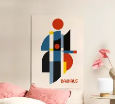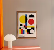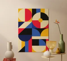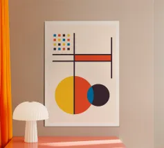 Une puissante composition abstraite Bauhaus définie par le chevauchement dynamique de formes géométriques et une palette audacieuse de rouge, de jaune, de bleu et de noir. Le dessin présente des cercles de différentes tailles qui se croisent avec des rectangles verticaux et horizontaux, créant ainsi des formes complexes et superposées. Cette pièce illustre parfaitement l'importance accordée par les constructivistes à la géométrie pure et à l'interaction des couleurs. Il s'agit d'une pièce idéale pour un décor moderne, minimaliste ou du milieu du siècle. Le poster numérique est fourni à une résolution supérieure de 7000x5000 pixels à 300 dpi, garantissant une qualité d'impression et une profondeur de couleur inégalées.