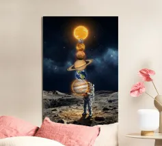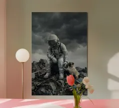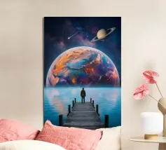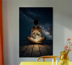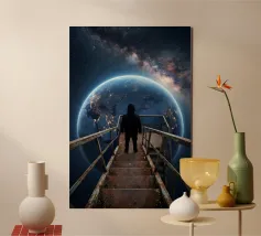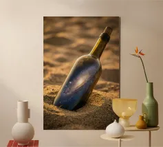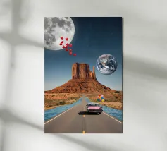 Découvrez la magie du voyage et du ciel nocturne grâce à cette œuvre d'art atmosphérique représentant une main qui touche délicatement le hublot d'un avion surplombant des dunes désertiques rougeoyantes. Un croissant de lune brille dans un ciel bleu profond rempli d'étoiles, créant un mélange serein d'errance et d'émerveillement. Les sables chauds et dorés contrastent magnifiquement avec les tons frais de la nuit, capturant le sentiment de solitude, de réflexion et de rêve au-dessus du monde. Parfait pour les amateurs de voyages, les minimalistes et les fans d'art cinématographique et de vues de fenêtre rêveuses.
