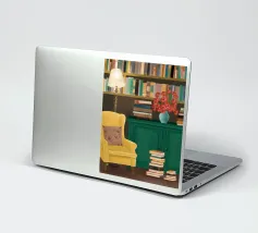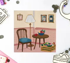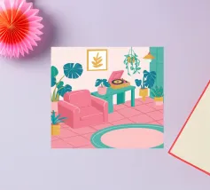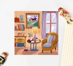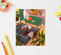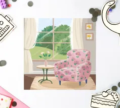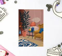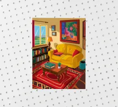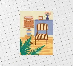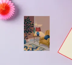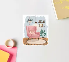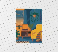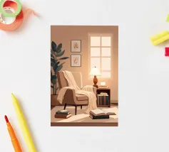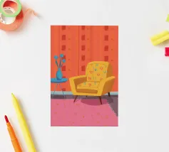 Illustration d'un coin lecture avec un fauteuil jaune confortable, un lampadaire et une table d'appoint avec une plante. Cette scène est un sanctuaire chaleureux, accueillant et parfait pour la lecture et la relaxation.