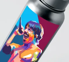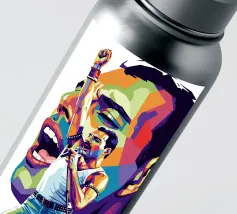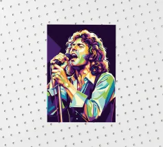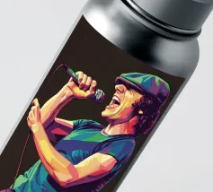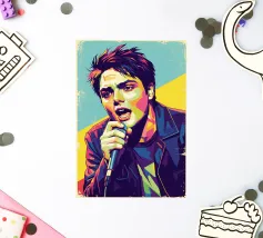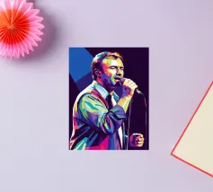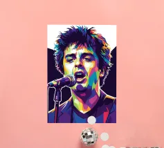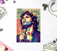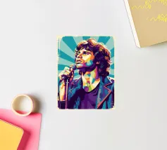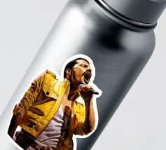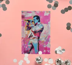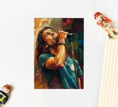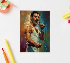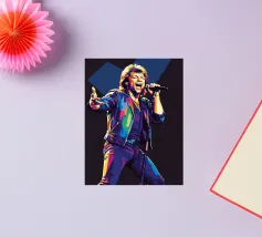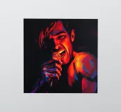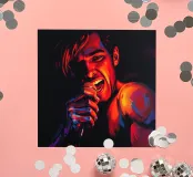 Représentation dynamique et colorée d'un homme chantant passionnément dans un microphone. L'éclairage intense de la scène met en valeur ses traits expressifs et son physique musclé.