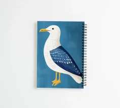 The picture shows a minimalist seagull illustration with a clear, graphic style. The seagull has a white body, blue wings with white accents and a yellow beak and legs. The background is blue, which creates a nice contrast to the white seagull. The style is simple, modern and decorative, with a reduced colour palette and clean lines - almost like a stylised logo or modern wall art. A beautiful example of graphic design art!