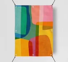 Eine Abstrakte popart Motiv mit 70er Charme zeigt bunte Farbfelder und Muster, in orange-pink-grün. Die Farbige Struktur treffen auf moderne, spielerische Illustrationen im grafischen Design. Lebendig und strukturiert, mit einer klaren, geometrischen Ästhetik.