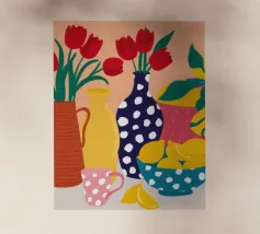 Composition abstraite moderne de diverses formes botaniques stylisées et de feuilles dans une palette de terracotta, de beige et de bleu foncé sur un fond clair.
