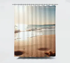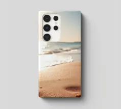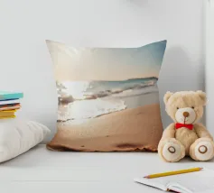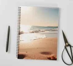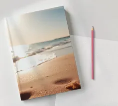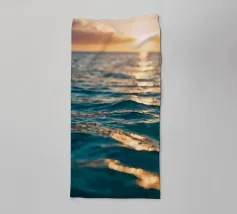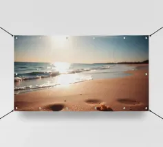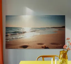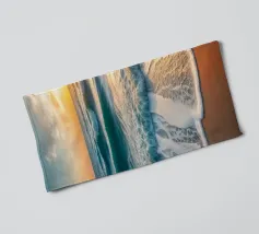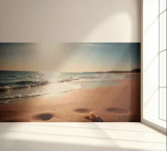 Un magnifique coucher de soleil illumine une plage paisible, projetant des tons chauds sur le sable doux. De douces vagues ondulent en rencontrant le rivage, créant une atmosphère sereine.